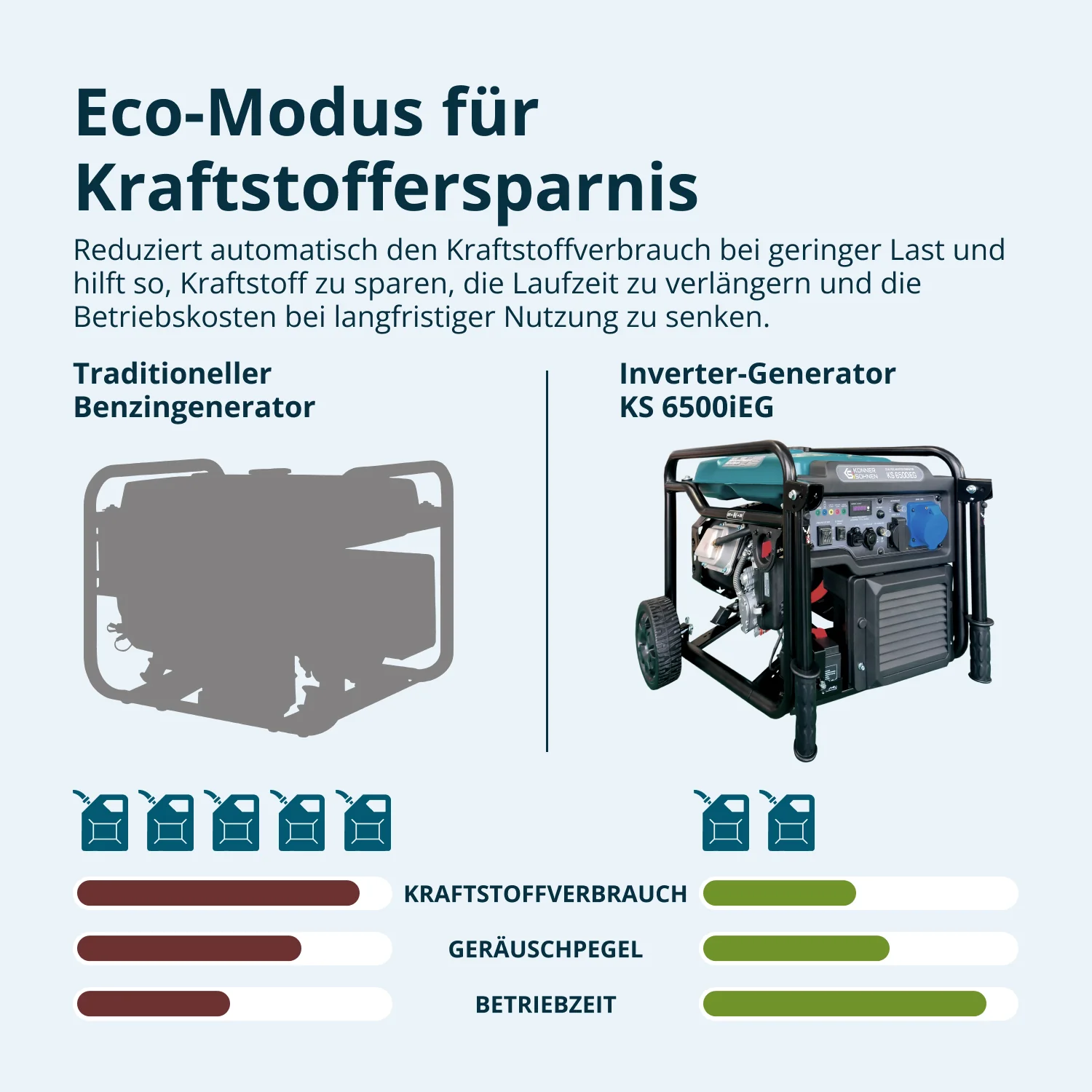 Der KS 6500iEG ist ein moderner Inverter-Generator mit Dual-Fuel-Technologie, der wahlweise mit Benzin oder Flüssiggas (LPG) betrieben werden kann. Diese Flexibilität senkt Betriebskosten und stellt sicher, dass auch bei eingeschränkter Kraftstoffverfügbarkeit weiterhin Strom zur Verfügung steht. Im Gasbetrieb reduziert sich die Leistung lediglich um ca. 10 %.