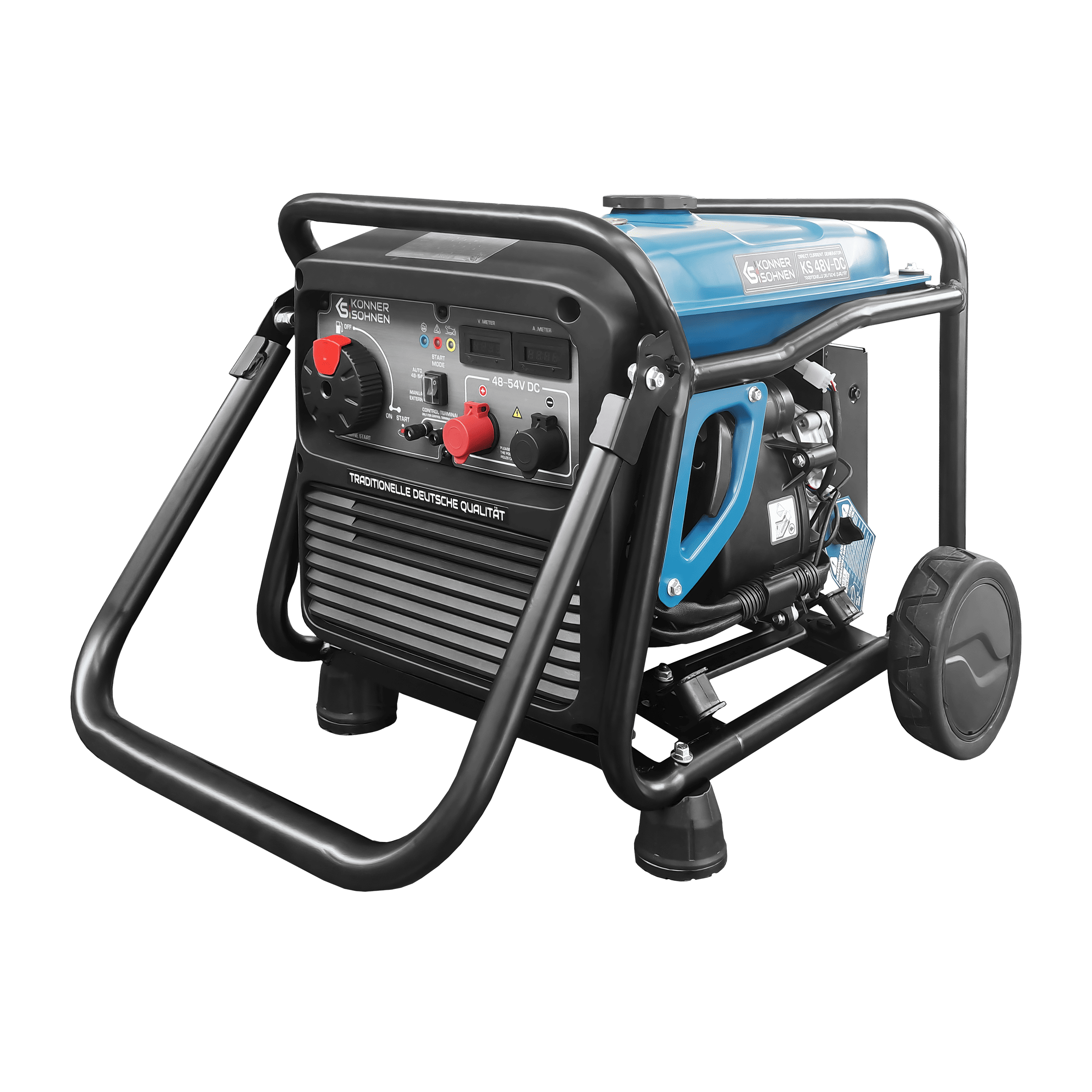 Der Könner & Söhnen KS 48V-DC ist ein speziell entwickelter Gleichstromgenerator zum Laden von 48-V-Batteriesystemen im Bereich 50–55 V. Er eignet sich besonders für LiFePO₄-Batterien mit 51,2 V Nennspannung sowie andere Energiespeicher mit entsprechender Ladespannung. Damit ist er ideal für Solaranlagen, Off-Grid-Systeme, Telekommunikationsanlagen oder Energiespeicherlösungen.
